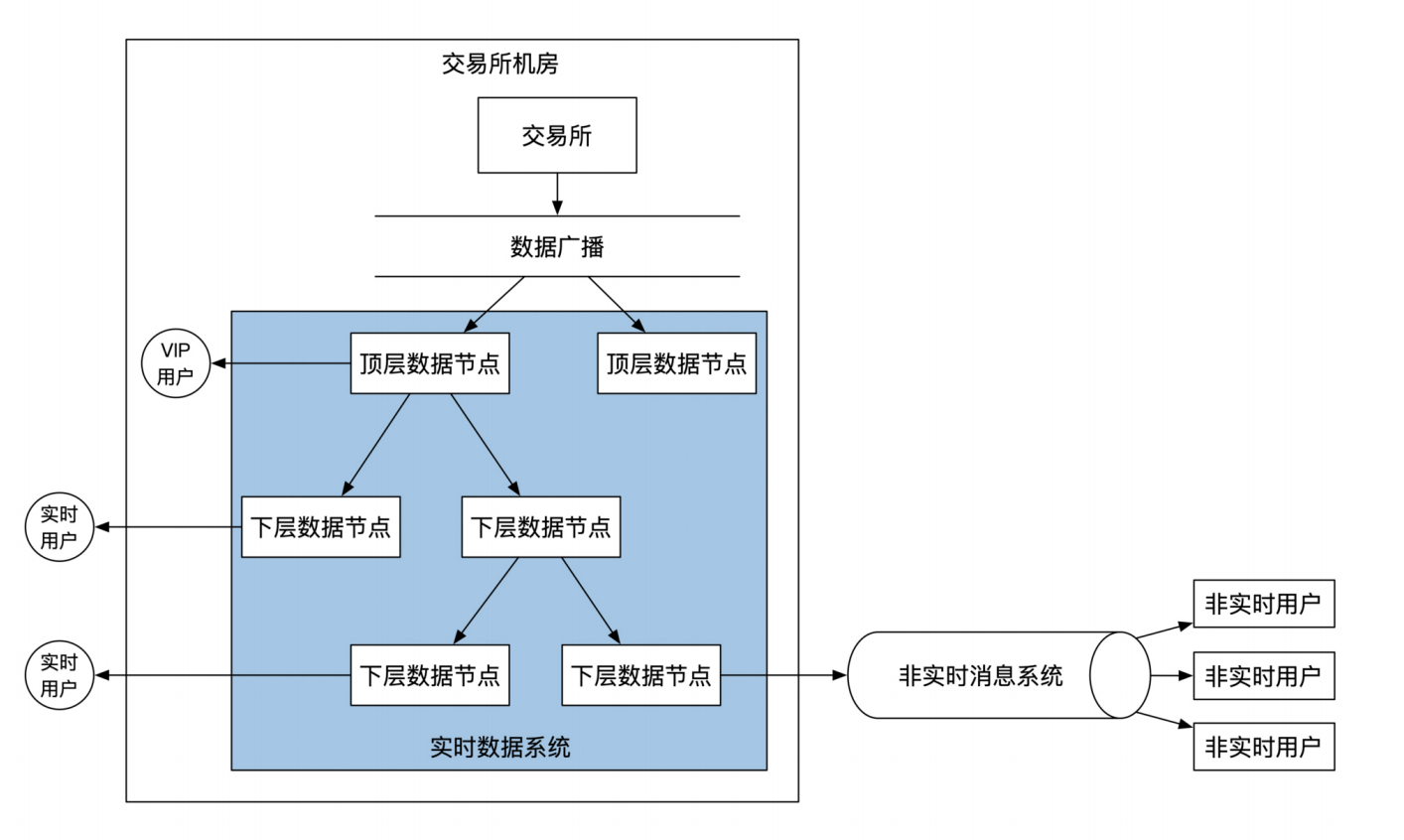 交易所收到消息后,通过广播的方式发送到数据节点;数据节点按照优先级通知vip客户,然后通知下一层数据节点;最下层节点通过推送方式采用非实时的方式通知客户。